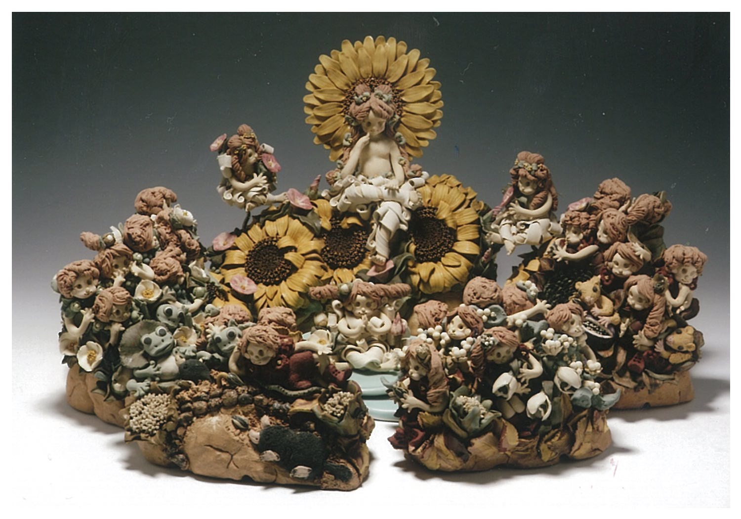 土のフェアリーをモチーフとした、オーナメント、花器、ランプ、陶板、小さな箸置きから大きな陶壁まで制作しています。